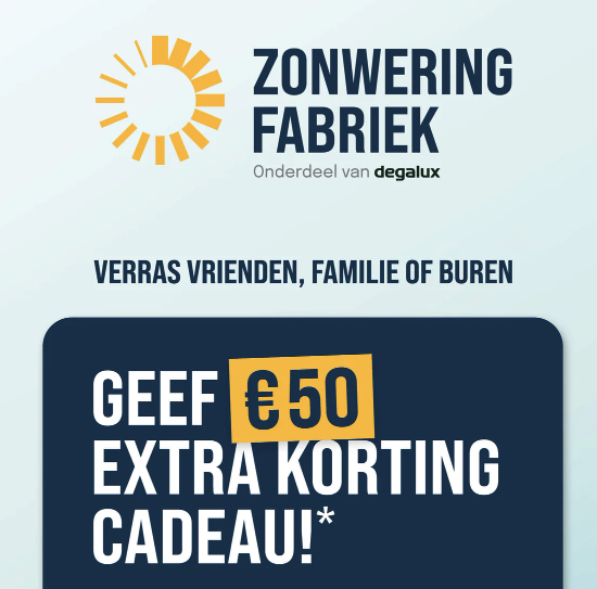 Vanaf nu krijg je bij je bestelling een cadeaubon die je kunt geven aan vrienden, familie of buren. Zo kunnen zij profiteren van €50 extra korting op hun bestelling.