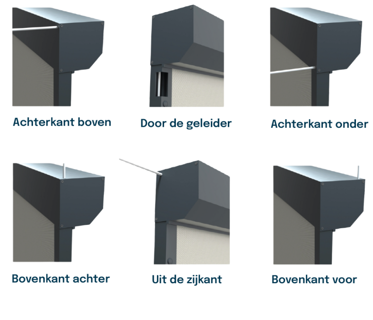 Aan elke motor zit een witte kabel die moet worden aangesloten op de stroom. Om de montage wat gemakkelijker te maken, kun je zelf kiezen waar wij de kabel naar buiten moeten voeren. De opties waaruit je kunt kiezen, vind je hiernaast.