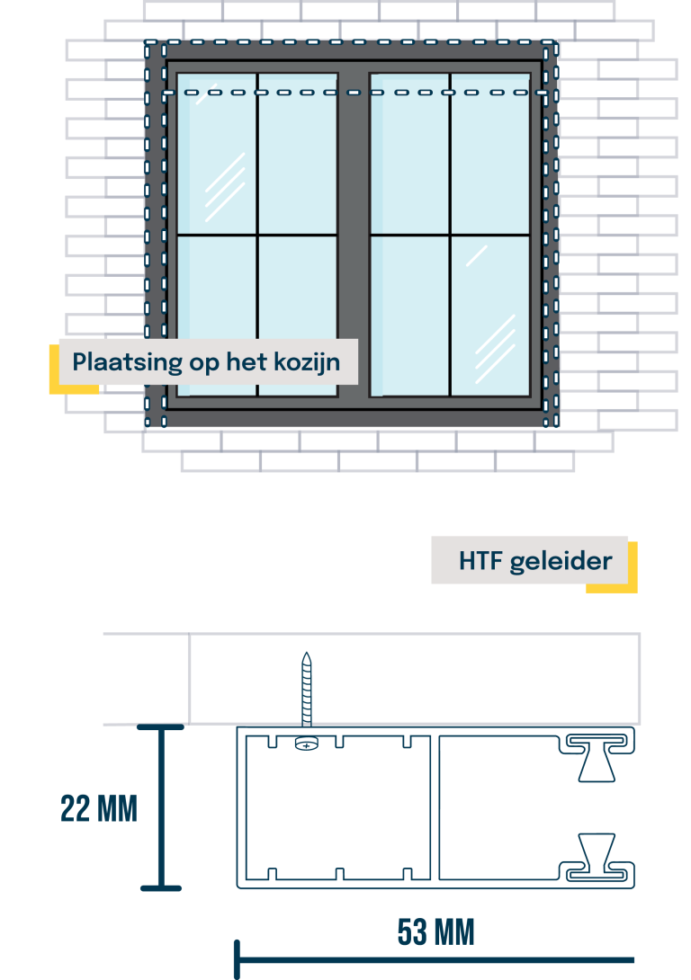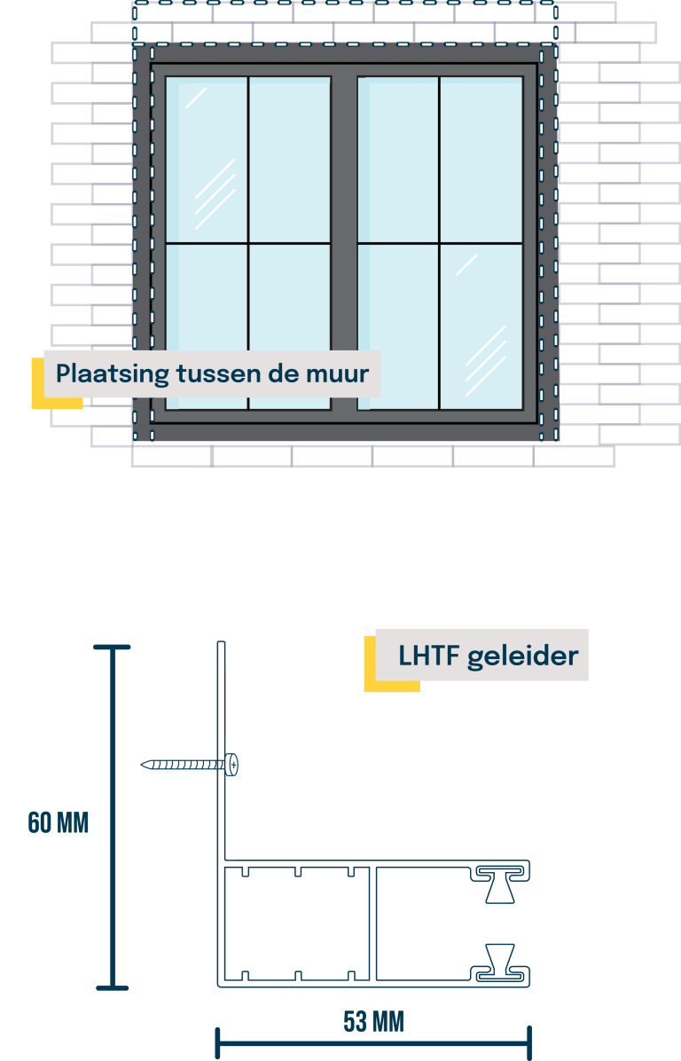 Je gebruikt een speciale geleider, namelijk de LHTF 53 x 60 mm. Dit is een geleider met lip. Je zijgeleiders zet je vast in de zijkanten of dagkanten van je muur, daardoor komen je zijgeleiders voor je kozijnen te zitten.