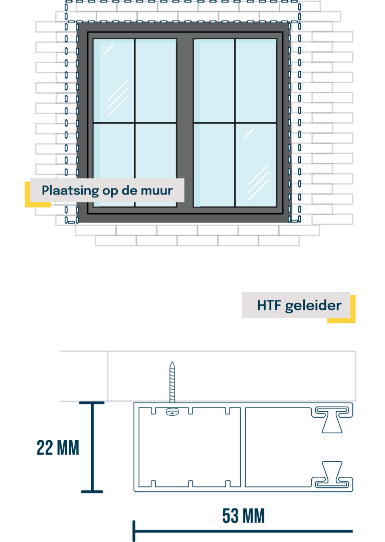 Je gebruikt de HTF 53 x 22 mm geleiders. Dit zijn platte rolluikgeleiders die je gebruikt voor plaatsing op de muur of op het kozijn.