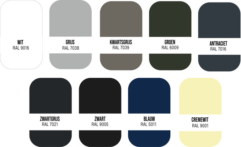 • Zwart is gelijk aan RAL 9005 (extra levertijd ±2 weken)